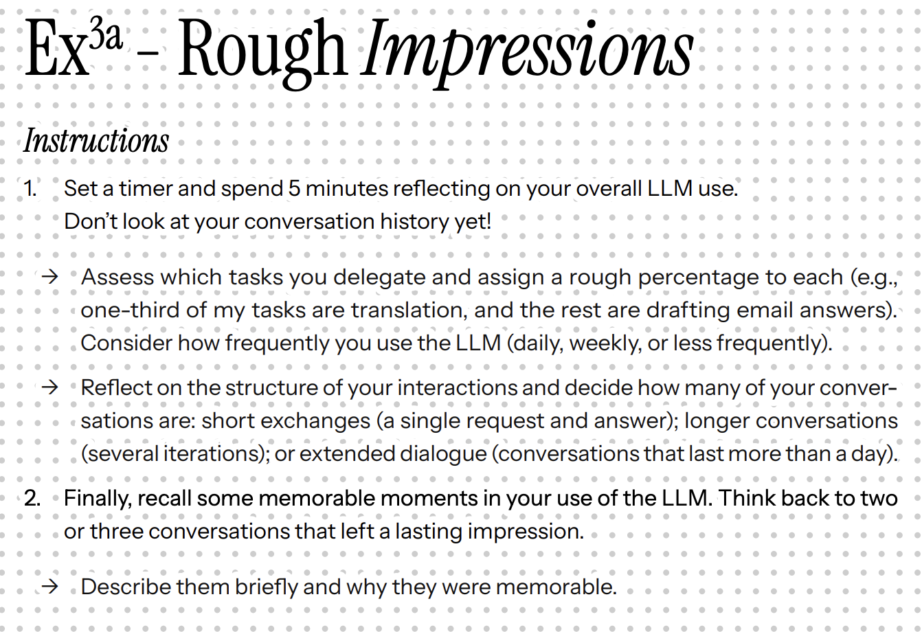 → Analysez la structure de vos interactions et estimez combien de vos conversations sont : de courts échanges (une seule demande et une réponse) ; des conversations plus longues (plusieurs itérations) ; ou des dialogues prolongés (qui s’étendent sur plus d’une journée). Enfin, remémorez-vous quelques moments marquants dans votre utilisation du LLM.